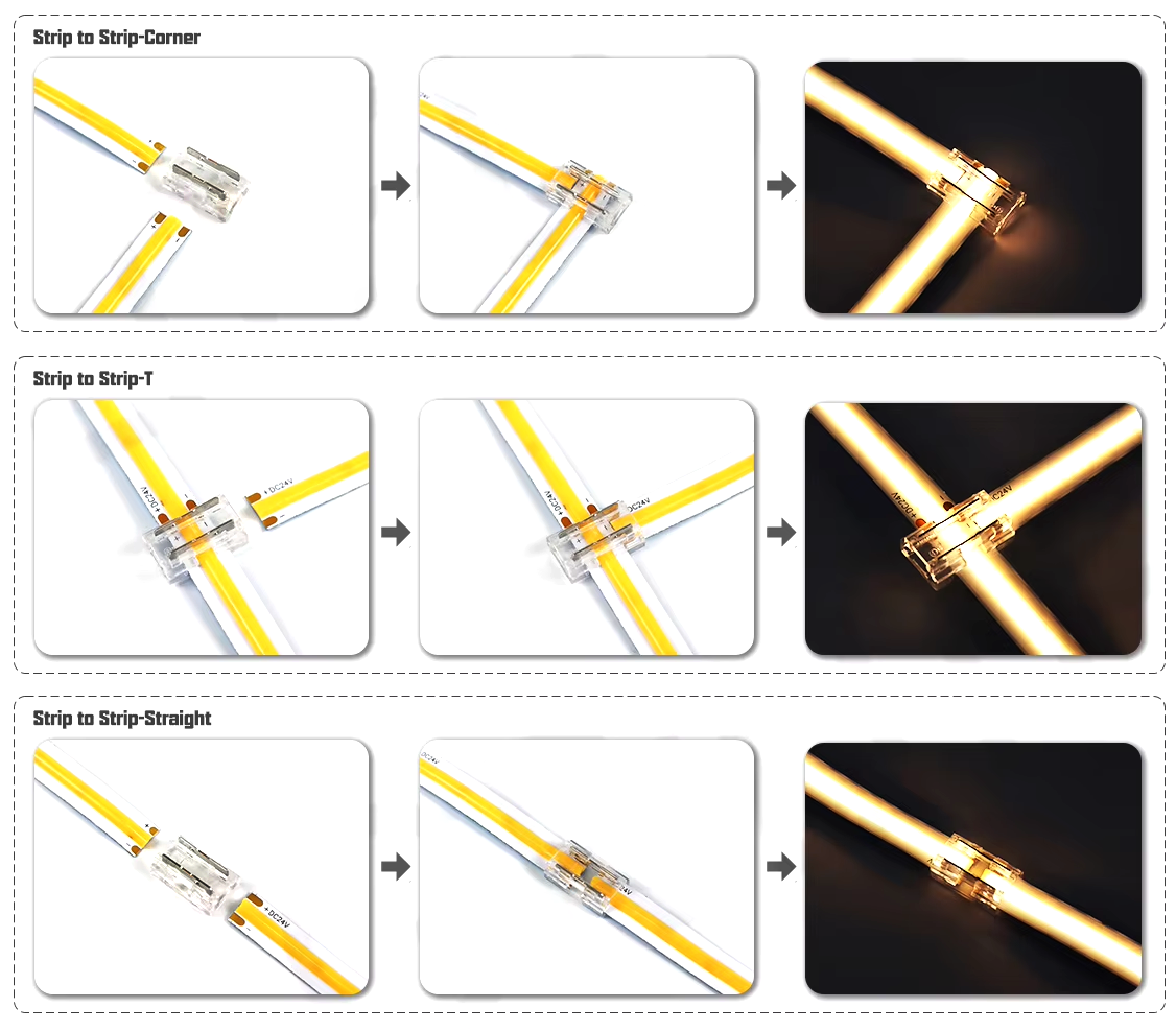 3rd generation LED strip connectors are a fast and convenient solution that allows for tool-free lighting installation. Thanks to crimping technology, installing or upgrading LED lighting becomes simple and intuitive – just plug the strip into the connector. Anyone, even without experience or specialized tools, can create a stable and safe connection in just a few moments. This is not only a time saver but also a reduction in installation costs. Products are packaged in sets of 10 in practical plastic bags with a euro hanger and informational label.