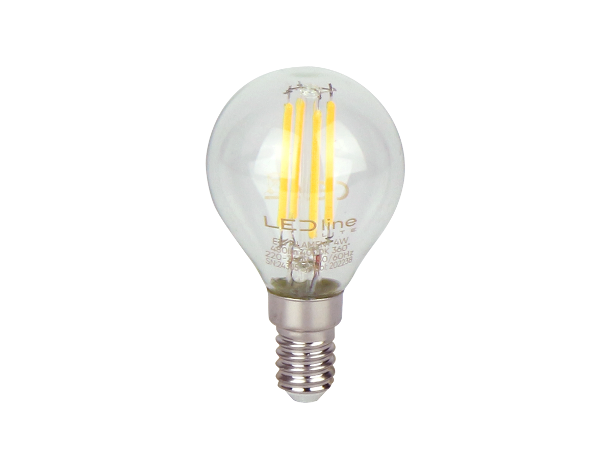 The LED line LITE E14 4W 4000K 480lm FILAMENT G45 bulb is a modern and energy-efficient lighting solution designed to enhance various interior spaces. Featuring advanced Filament technology, this bulb combines a vintage aesthetic reminiscent of traditional incandescent lamps with exceptional efficiency, boasting an impressive luminous efficacy of 120 lm/W.