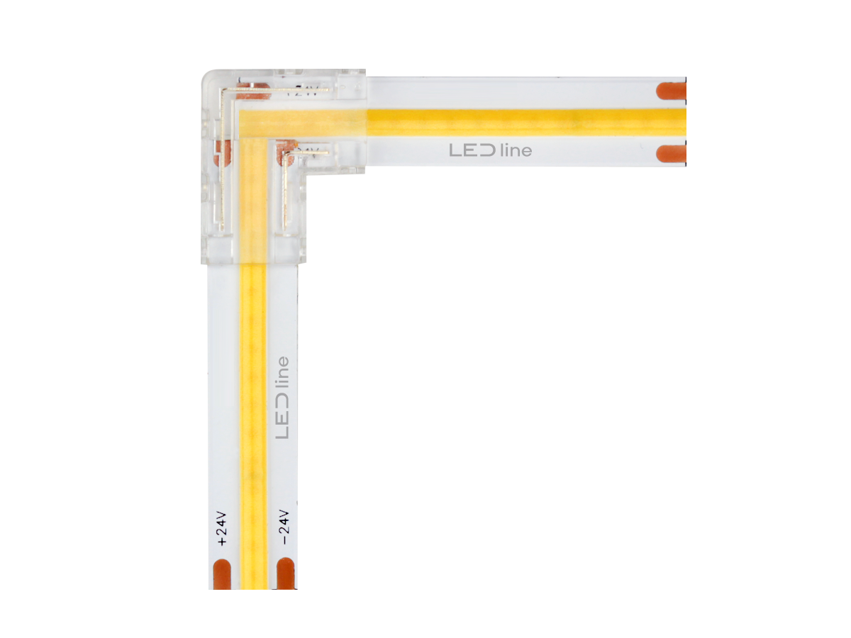 The LED line PRIME connector for COB LED strips is an essential element that allows for easy and quick connection of LED strips This double L-type connector is designed for 10mm wide strips and features 2 pins, ensuring a stable electrical connection.