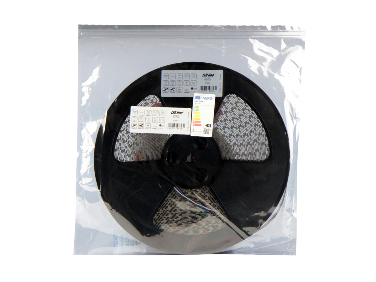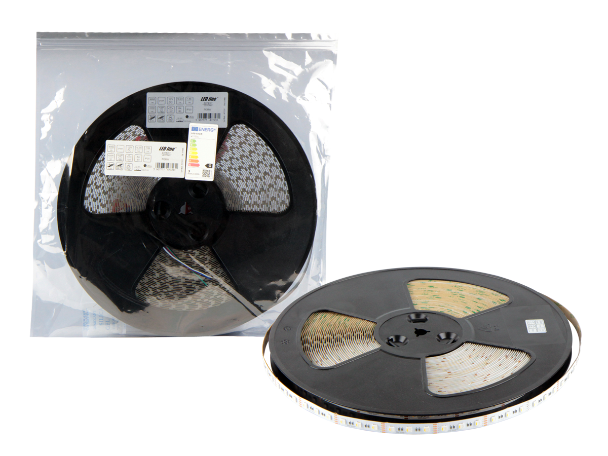 The LED strip 300 SMD from the LED line PRIME brand is an innovative lighting solution, characterized by a power of 19.2 W per meter and an operating voltage of 12 V DC. It emits warm light with a color temperature of 2700 K and an additional RGBW function, providing a wide range of colors. With a length of 30 m, it is perfect for various arrangements. The IP20 protection class guarantees safe use indoors.
